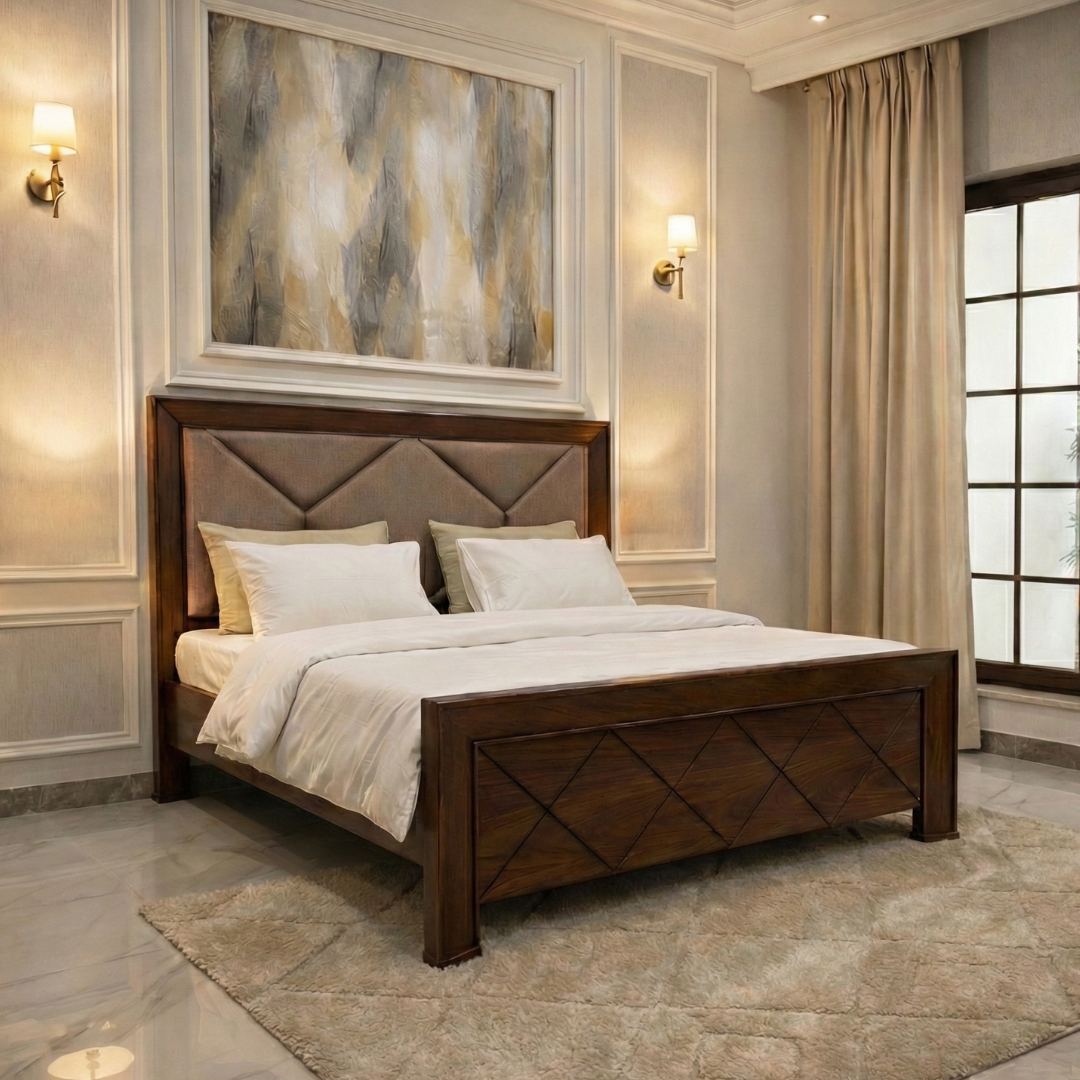 Designed to stand out, the Cross Craft Bed showcases elegant cross-panel detailing on the footboard combined with a soft cushioned headboard framed in rich Red Oak. The strong wooden structure ensures stability and support, while the walnut finish enhances the natural grain for a premium appearance.
