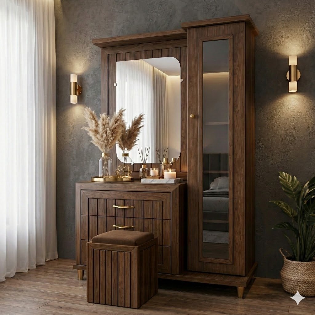 The neatly padded upholstered top enhances comfort while maintaining a clean and structured silhouette. Its balanced combination of defined woodwork and soft seating makes it a perfect addition to modern and contemporary bedroom interiors.
